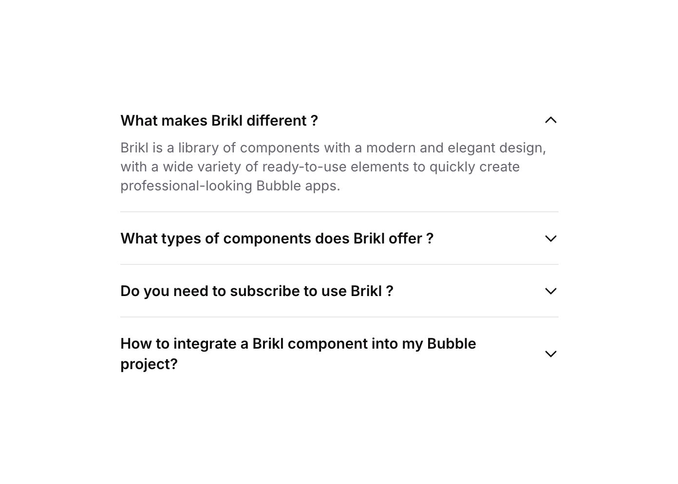 Accordion 01 is a FAQ-style accordion component featuring multiple collapsible items. Each item contains a title, a caret icon, and a hidden content panel that expands or collapses when clicked. It uses custom states to track which item is currently open, toggling visibility accordingly. Ideal for FAQ sections, feature explanations, or any content that benefits from progressive disclosure.