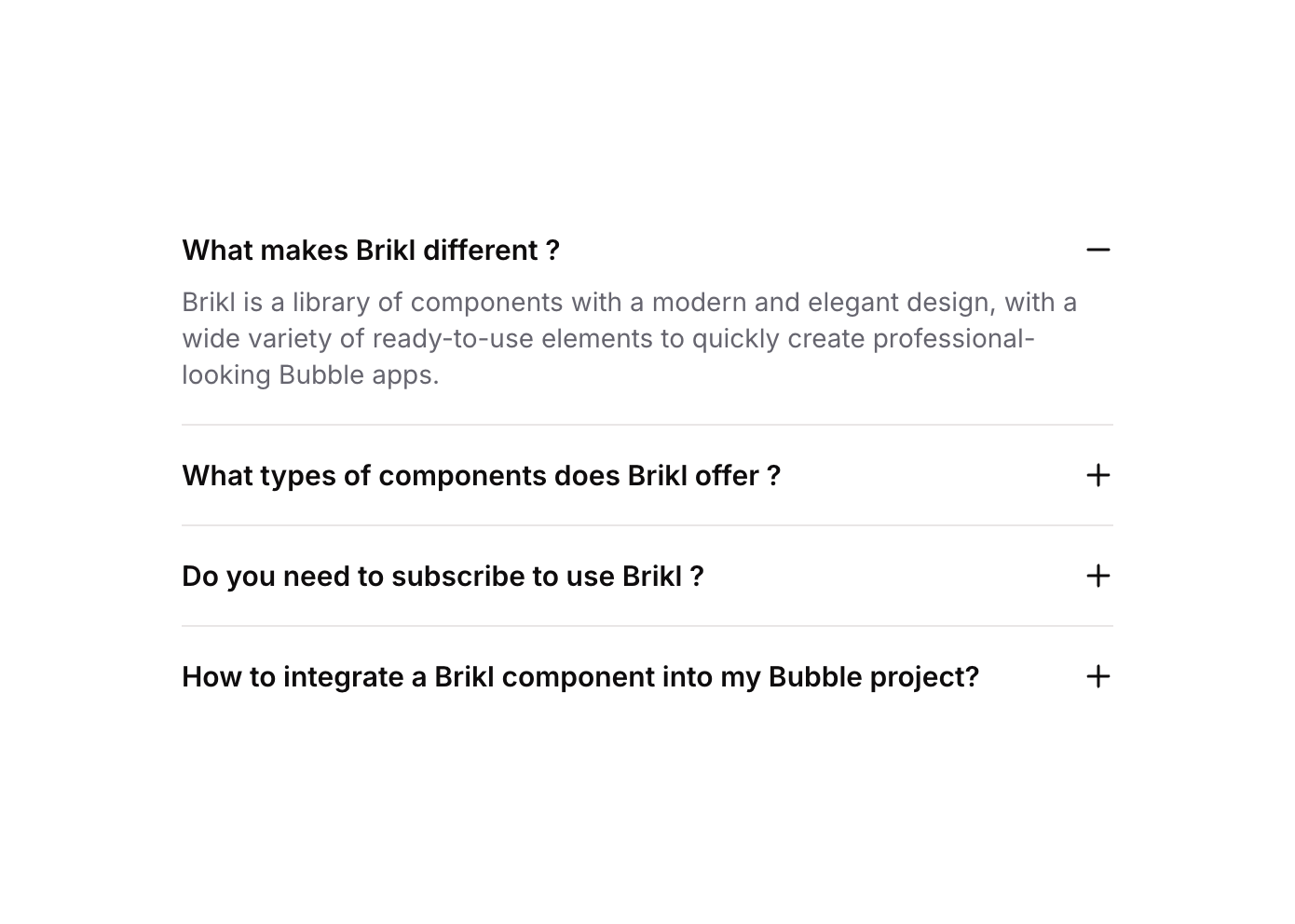 Accordion 02 is an interactive FAQ-style component built in Bubble.io that displays three expandable/collapsible items. Each item consists of a clickable row with a bold question title and a plus icon, toggling the visibility of an answer text below. It uses custom states to track which item is open, allowing users to reveal or hide content on demand. Ideal for FAQ sections, feature explanations, or any structured Q&A layout.