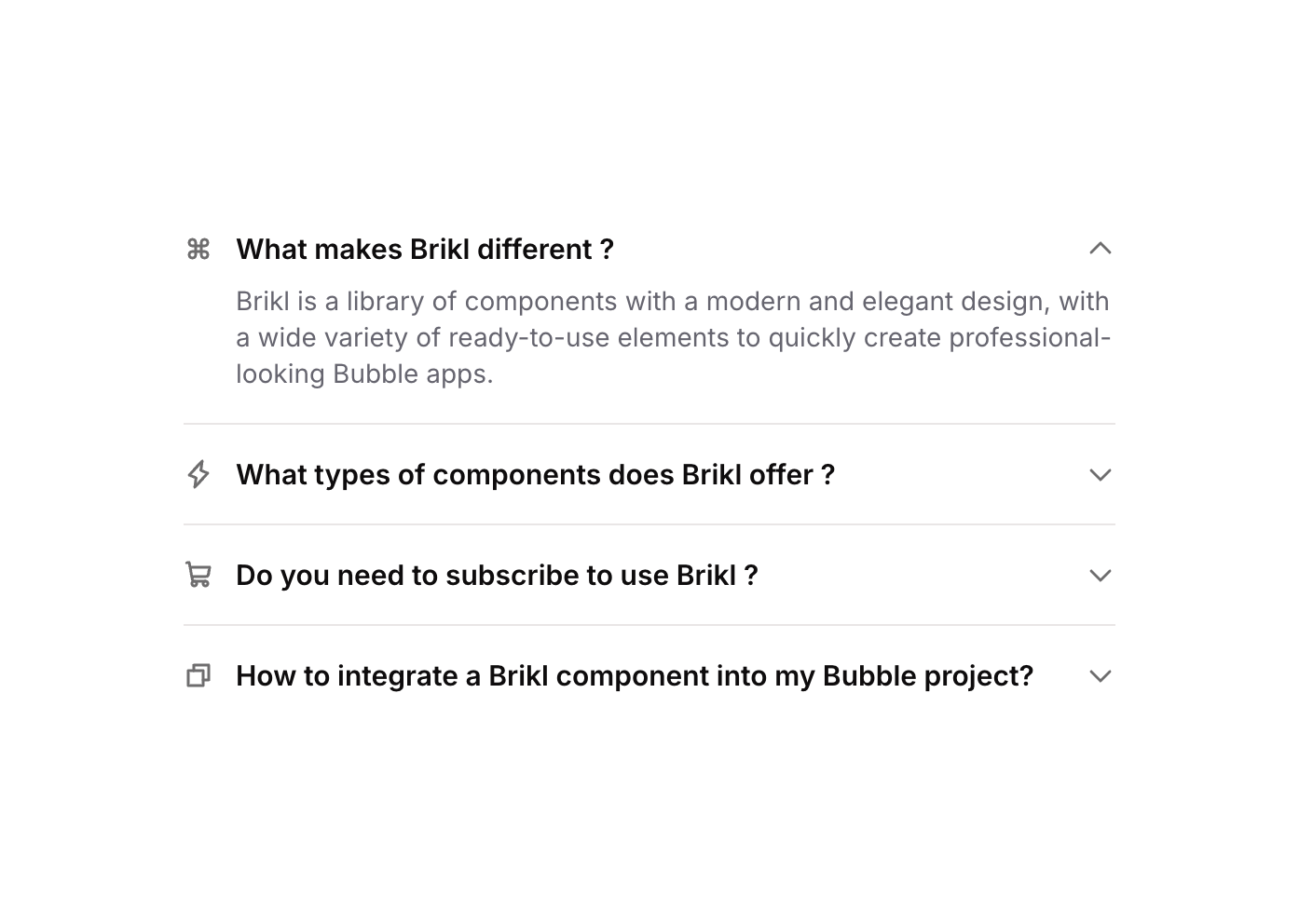 Accordion 03 is a FAQ-style accordion component featuring multiple toggle items, each with a leading icon, a bold question title, a caret indicator, and collapsible answer content. It allows users to expand or collapse individual sections to reveal descriptive text, making it ideal for FAQ sections, help centers, or informational pages in a Bubble project.