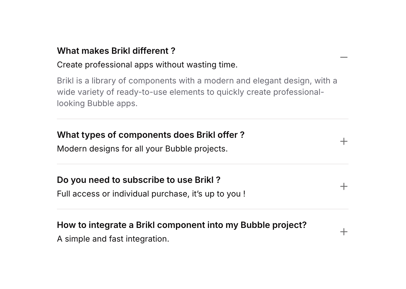 Accordion 06 is a collapsible FAQ-style component featuring multiple toggle items, each with a title, sub-header, and expandable content area. Users click on a row to expand or collapse its content. It uses custom states to track which accordion item is open, making it ideal for FAQ sections, feature explanations, or any content that benefits from a compact, expandable layout.