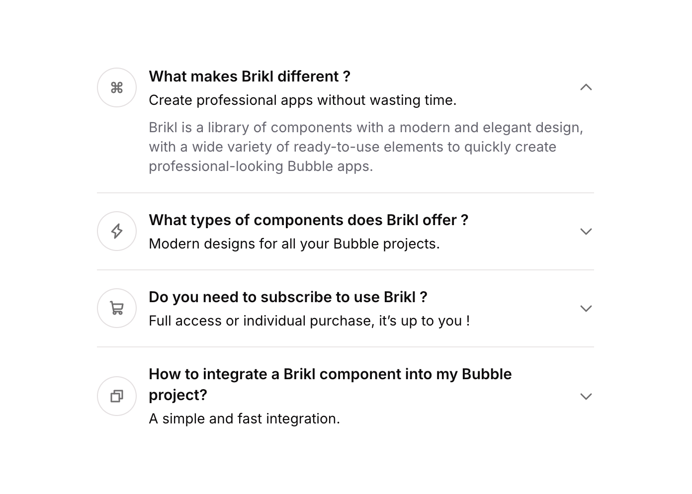 Accordion 07 is an interactive FAQ-style accordion component featuring multiple toggle items. Each item displays an icon, a bold question title, a subtitle, and expandable answer content. Users click on a toggle to expand or collapse the corresponding answer. It is designed for both web and mobile layouts and uses custom states to manage which accordion item is currently open.