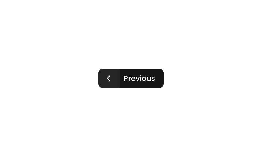 Button 25 is a split navigation button component combining two joined button segments: a left icon button (caret-left) and a ‘Previous’ label button. Together they form a compound previous-navigation control with a dark theme, designed to allow users to navigate backward in a flow or paginated interface.