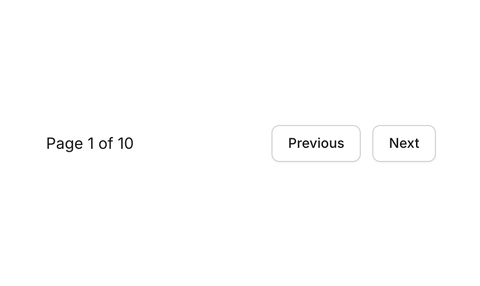 Pagination 05 is a navigation component that allows users to move between pages. It displays the current page position (e.g., ‘Page 1 of 10’) alongside Previous and Next buttons with icons. The Previous button is disabled on the first page, and both buttons have hover and disabled states for clear visual feedback.