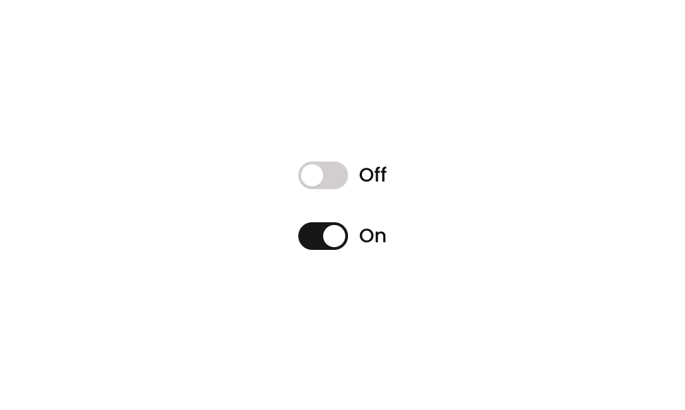 | On (active) | Custom state ‘active_’ is true on the parent group | Switch background changes to dark (rgba(27,23,24,1)), thumb aligns to the right, label displays ‘On’ |