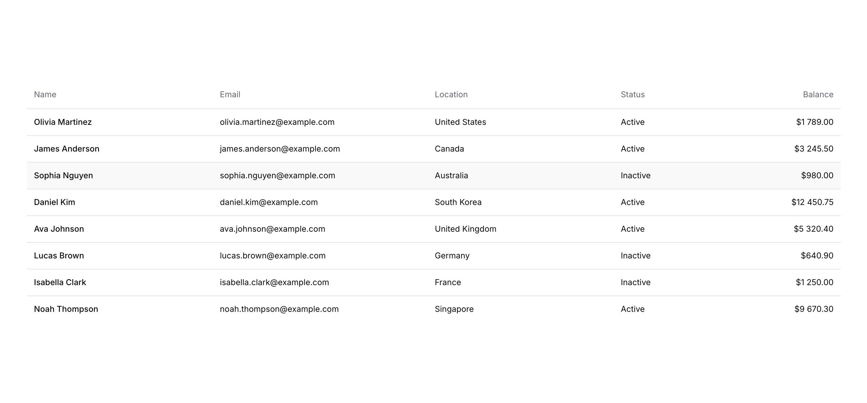 Table 01 is a structured data table component designed for web applications. It features a sticky-capable header row with column labels (Name, Status, Balance, Email, Location) and dynamic data rows that pull content from a data source. The table supports hover states on rows and is built using Bubble’s native Table element with defined column widths and alignment settings.