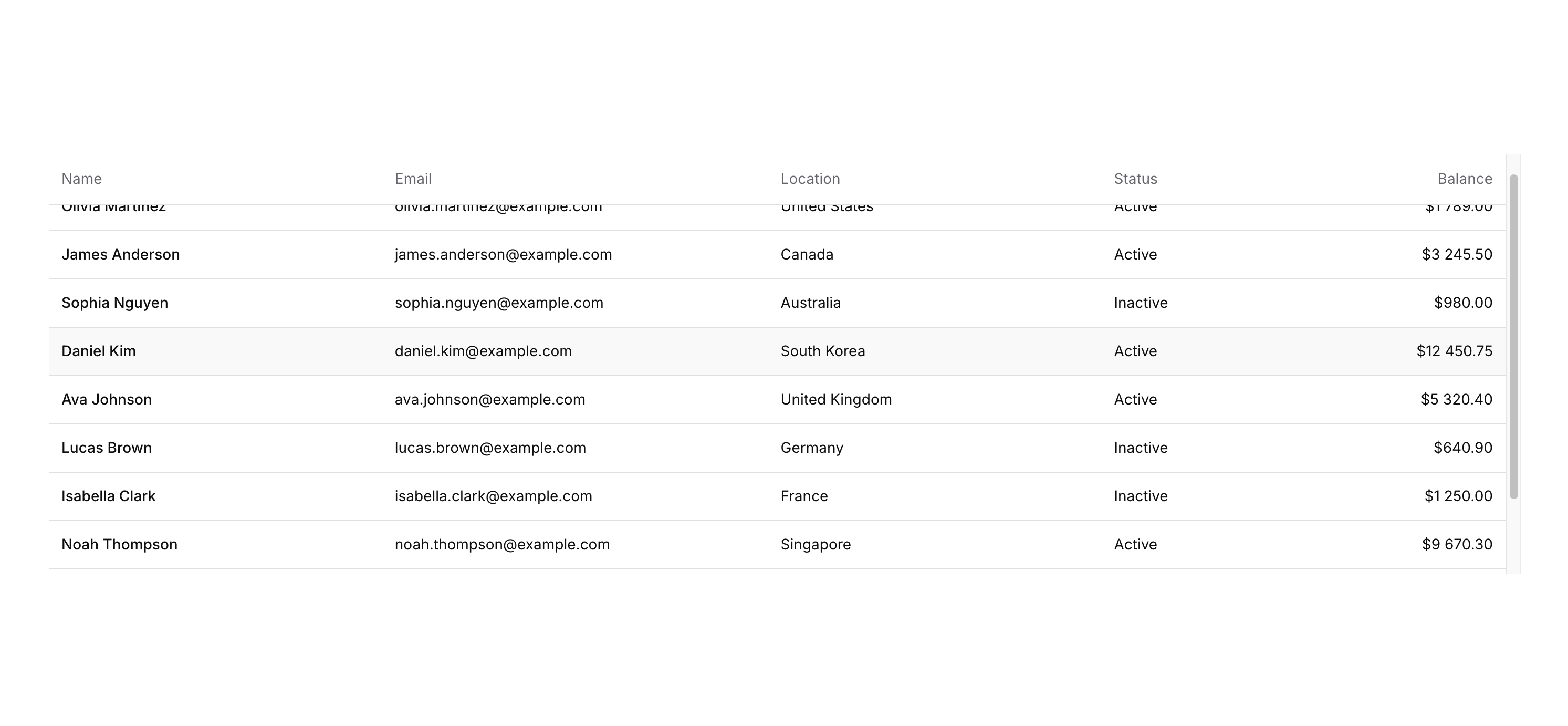 Table 02 is a free, web-based data table component built using Bubble’s native Table element. It displays structured data across five columns: Name, Email, Status, Location, and Balance. The header row uses muted gray labels, while data rows dynamically render values split from a pipe-delimited data source. Rows include a hover state with a subtle background color change, making it suitable for dashboards, admin panels, or any data listing interface.