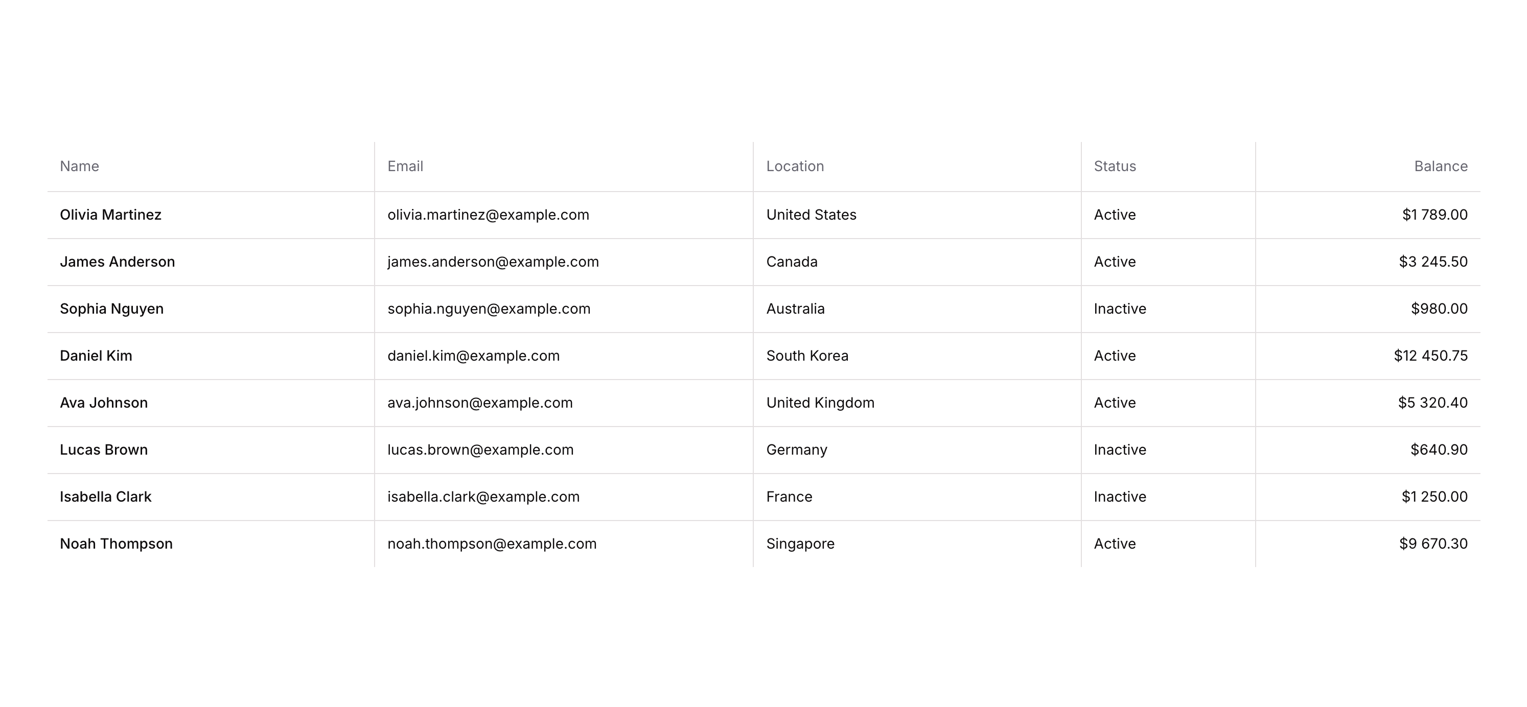 Table 03 is a structured data table component built using Bubble’s native Table element. It displays tabular data across five columns: Name, Status, Balance, Email, and Location. The header row contains styled label cells with muted gray text, while data rows dynamically populate from a pipe-delimited data source using TableCrossAxis ancestor references. The Balance column is right-aligned, and the Name column has a wider minimum width to accommodate longer values. It is designed for web use and suited for displaying lists of records such as users, customers, or contacts.