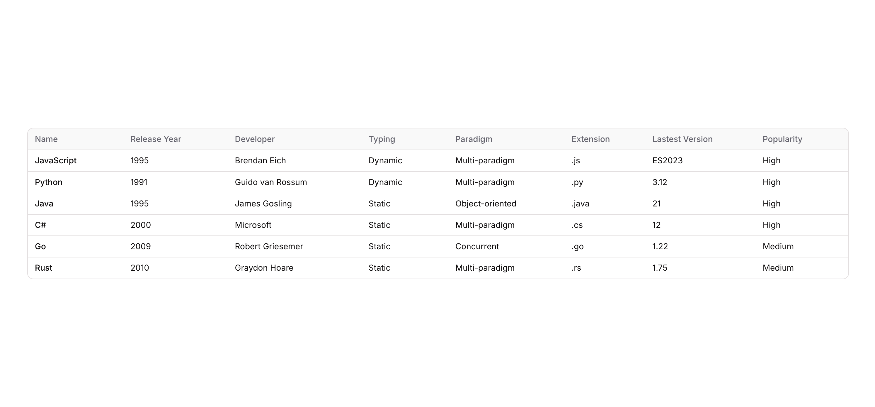 Table 06 is a structured data table component designed to display tabular information across multiple columns including Name, Typing, Paradigm, Release Year, Developer, Extension, Latest Version, and Popularity. It features a styled header row with a light background and uses Bubble’s native Table element for organized, readable data presentation. It is suited for displaying reference or comparison data such as programming language details.