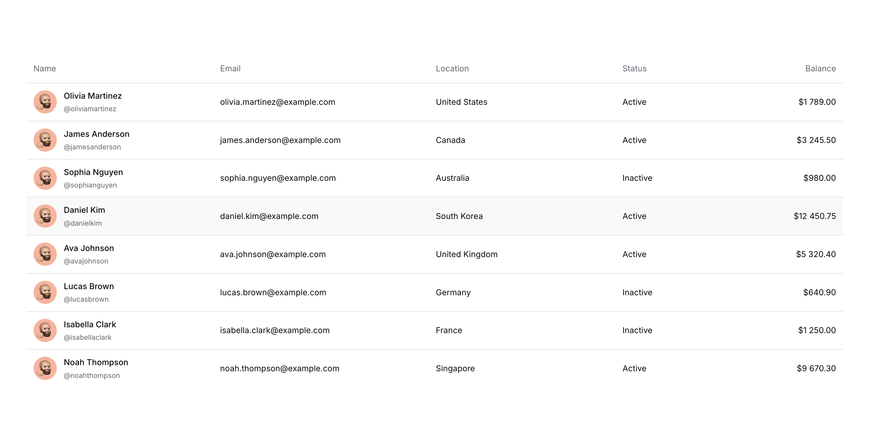 Table 08 is a structured data table component designed for web applications. It displays tabular user data across six columns: Name (with avatar), Status, Balance, Email, and Location. The table features a sticky header row, hover state highlighting on rows, responsive font sizing for mobile breakpoints, and right-aligned balance column. It is suited for dashboards or admin panels where user records need to be displayed in a clean, organized format.