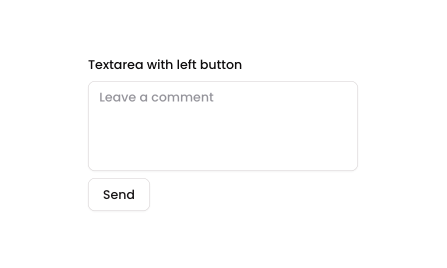 Textarea 05 is a comment/message input component featuring a descriptive label, a resizable multiline text input field with placeholder text, and a secondary ‘Send’ button with an icon. It is designed for collecting user input such as comments or messages, and is suitable for forms, chat interfaces, or feedback sections.
