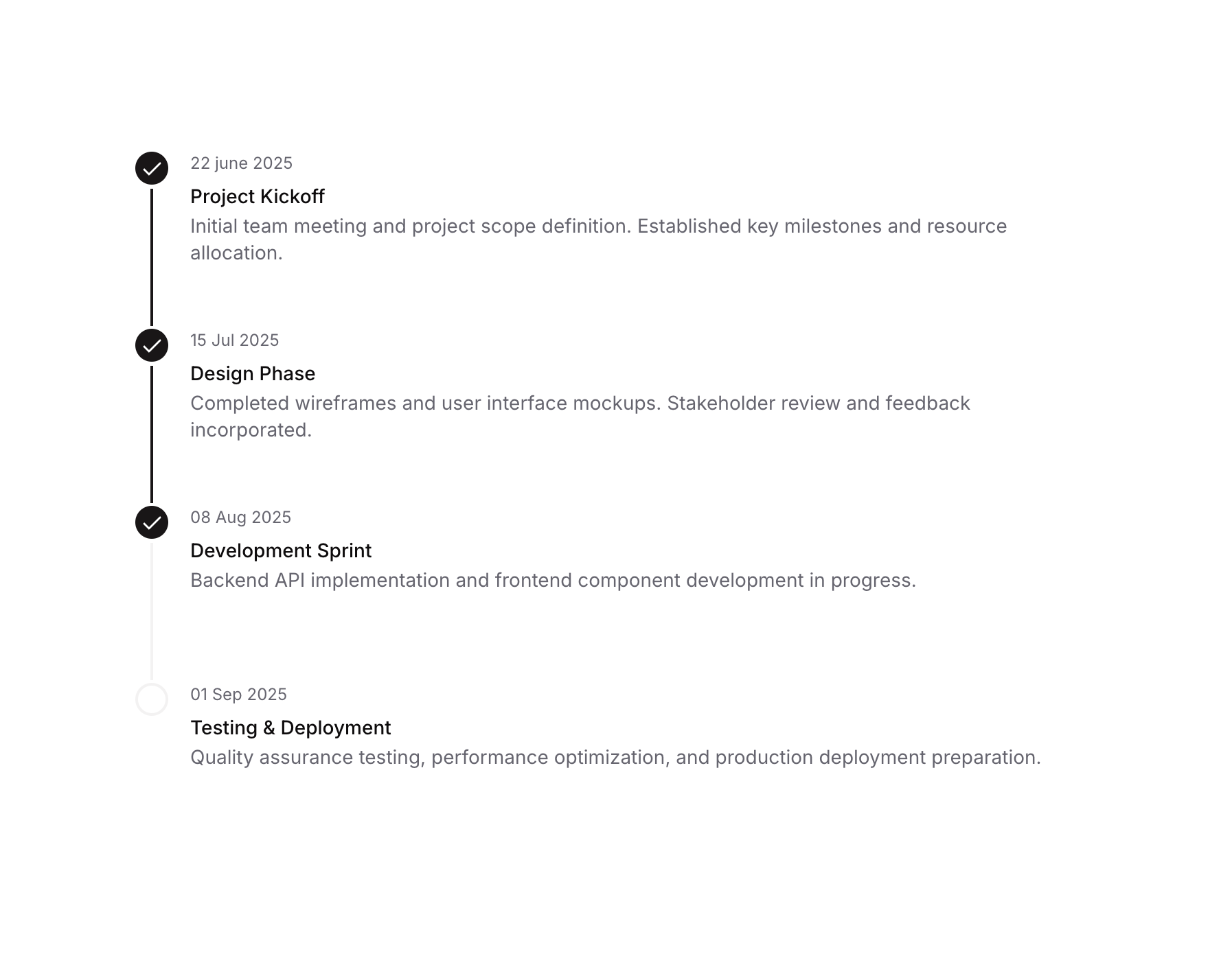 Timeline 05 is a vertical timeline UI component designed to display a sequence of events or project milestones. Each timeline item includes a circular icon indicator, a separator line connecting items, and a text block showing a date, title, and description. It is suitable for project progress tracking, onboarding flows, or any step-by-step process visualization.
