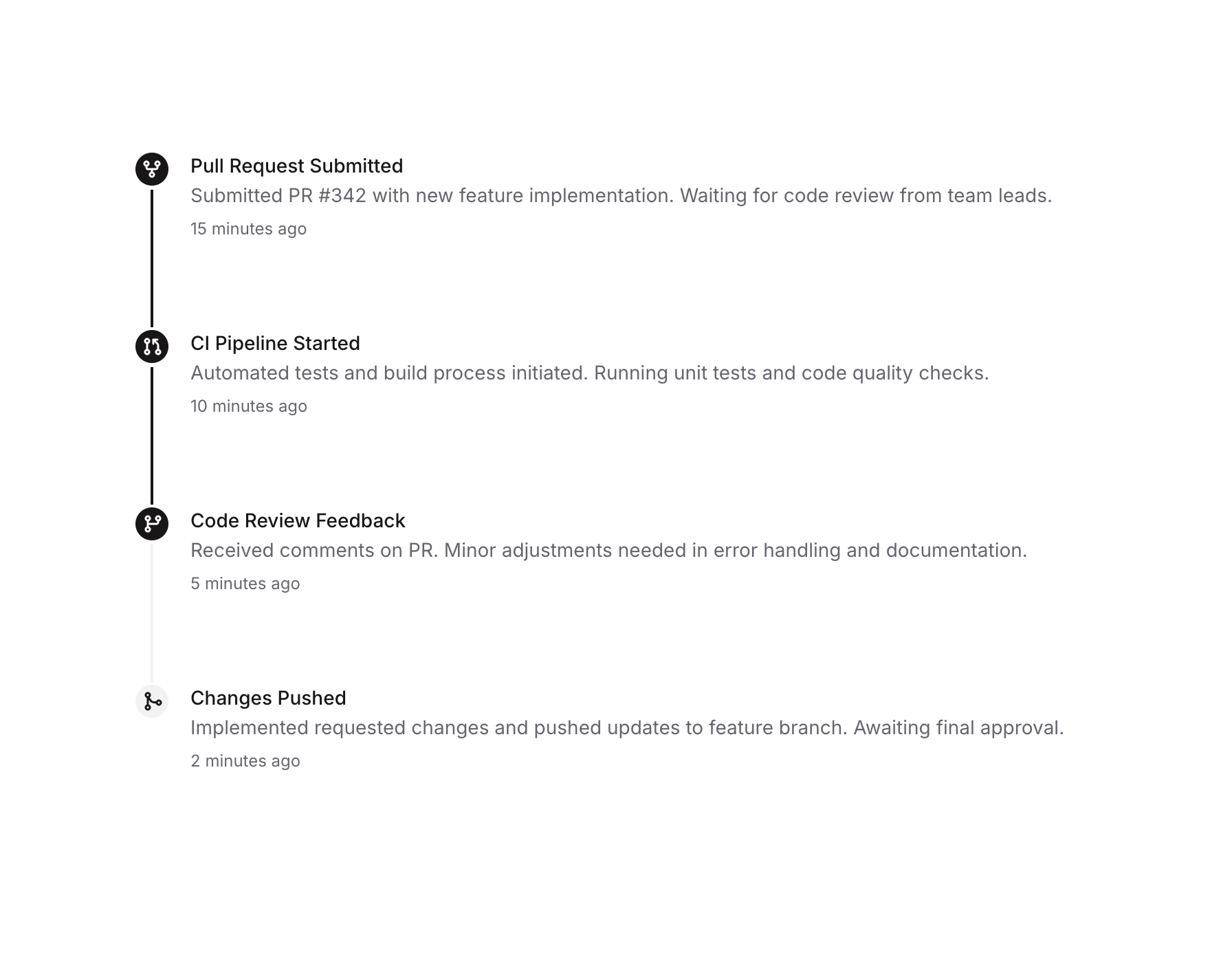 Timeline 06 is a vertical timeline UI component designed to display a sequence of events or activities. Each timeline item includes a styled icon indicator with a connecting separator line, a bold title, a descriptive text, and a relative timestamp. It is suited for activity feeds, changelog displays, deployment pipelines, or any ordered event history.