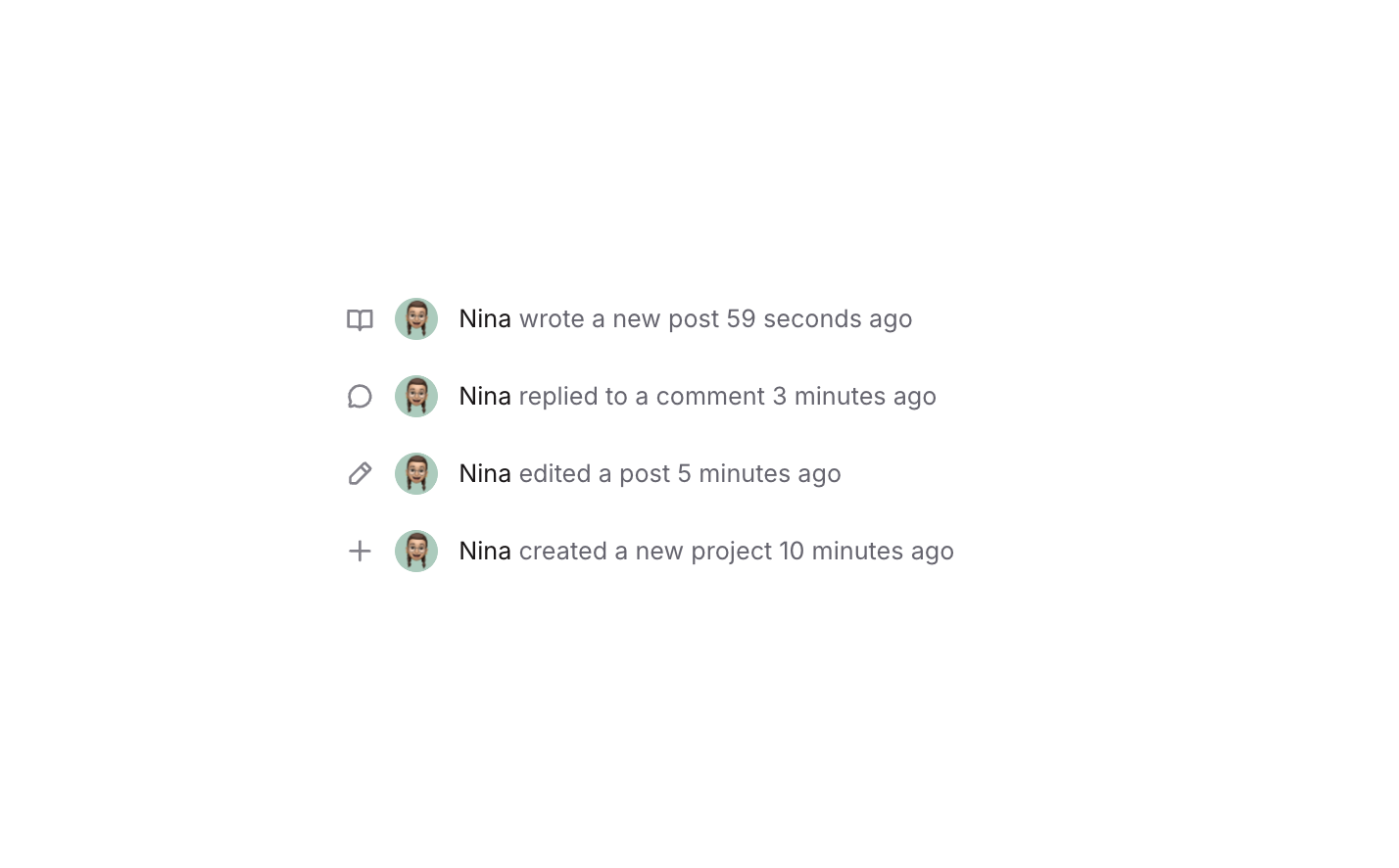 Timeline 09 is a vertical activity feed component displaying a list of user actions (e.g., wrote a post, replied to a comment, edited a post). Each item includes a circular avatar image, an action icon, and a descriptive text label with a timestamp. It is designed to show recent user activity in a clean, structured list format with subtle dividers.